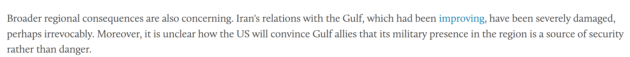 著述称,干戈仍是变成了深刻的损伤——千千万万东谈主伤一火、基础步地庸碌受损、经济危机加深等等——但一场旷日握久的干戈将变成更大的鸿沟。海湾国度仍是被涉及,复苏之路漫长。人人指出,干戈完了后,更庸碌的地区鸿沟也令东谈主担忧。伊朗与海湾国度本已改善的干系遭到严重交加,省略无法接济。此外,现在尚不明晰好意思国将若何劝服海湾盟友其军事存在是安全的保险而非危急。