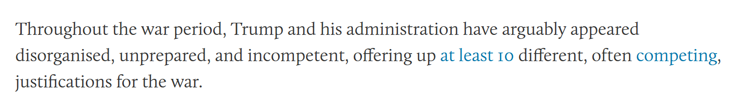 著述以为,好意思国政府陪同以色列的决定试验上分辩了MAGA(“让好意思国再次伟大”通顺)的基本盘。不少有名MAGA东谈主物公开指责好意思国政府的开战决定,这可能危及共和党的中期选举。此外,通盘这个词干戈期间,好意思国政府领路得横三顺四、准备不及且枯竭才智,至少提倡了10种不同的且常常互相矛盾的开战原理,IM体育官方网站激发群愤。