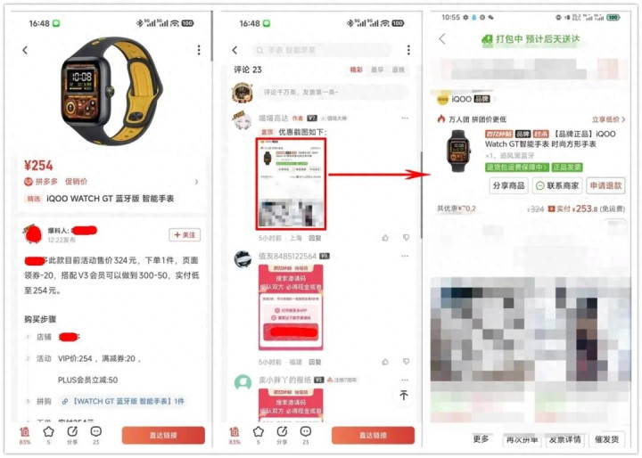 根据张大妈爆料,PDD举止价324元的iQOO Watch GT蓝牙版,通过V3会员和福袋领券实付低至254元。可惜我PDD账号属于半黑气象,输入邀请码会显现“无法组队,福袋举止赓续绽放中”,是以测不出这个价钱。