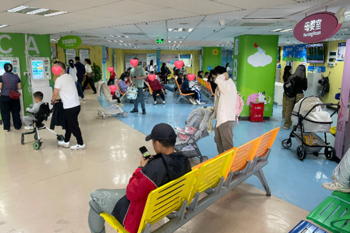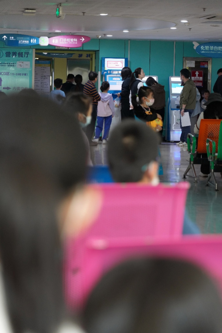 3月16日,深圳市儿童病院(福田)自助劳动区、诊室前不少家长带孩子候诊。