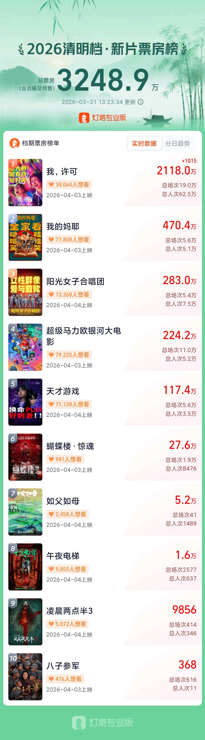 据网罗平台数据,罢休3月31日13时23分,2026年明朗档新片点映及预售总票房打破3200万,IM体育官方网站影片《我,许可》《我的妈耶》《阳光女子齐唱团》《超等马力欧星河大电影》《天才游戏》暂列前五。