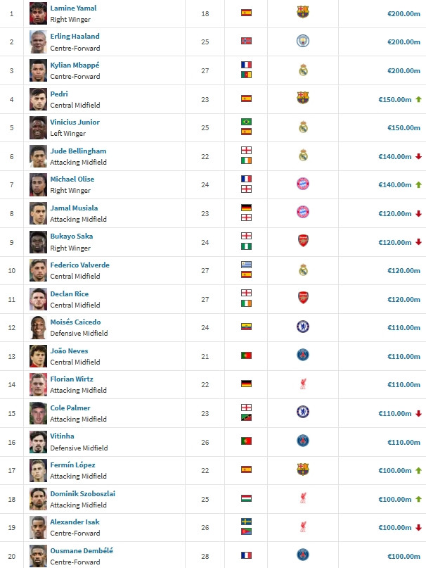 本日德转更新法甲球员身价,至此本月五大联赛球员身价照旧一起完成更新,目下足坛共有20个东谈主身价达到或非凡1亿欧元,具体球员如下,费尔明、索博涨至1亿欧元,阿尔瓦雷斯从1亿跌至9000万。
