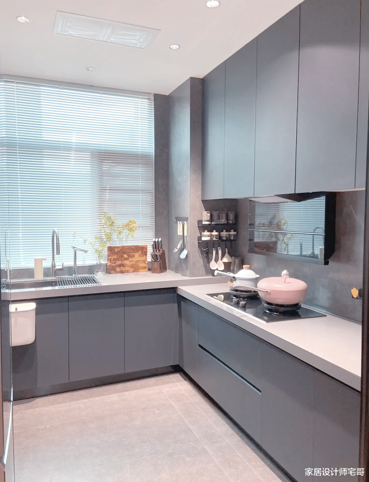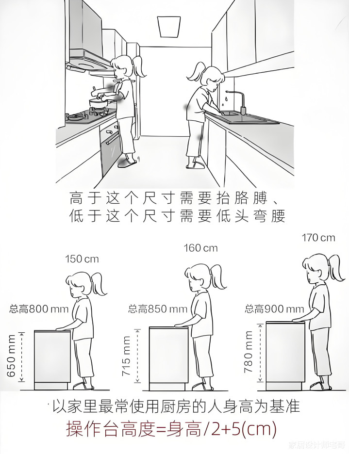 我给客户想象的厨房台面高度,都是按照客户家里经常作念饭的东谈主的身高来定的, 公式为身高÷2+5公分。