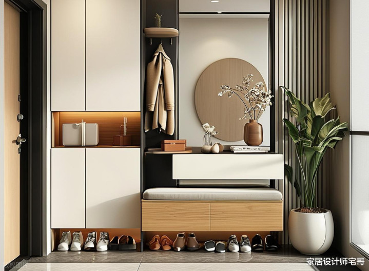 玄关鞋柜下方留出15-20公分悬空,每天回家换鞋都毋庸开关门,脚一踢,鞋子就进去了,门口才会一直窗明几净的。