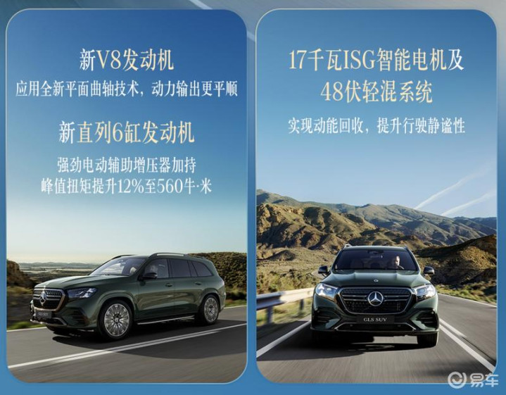 新一代GLS SUV的能源系统迎来全面进化,搭载全新升级的直列6缸与V8发动机,搭载48伏ISG智能电机系统。新直列6缸发动机,峰值扭矩擢升12%至560牛·米。新V8发动机最大功率由380千瓦提至395千瓦,峰值扭矩由730牛·米擢升至750牛·米。