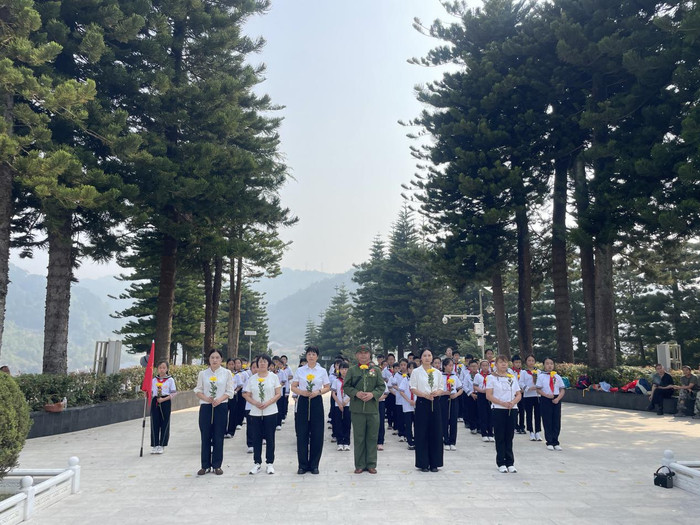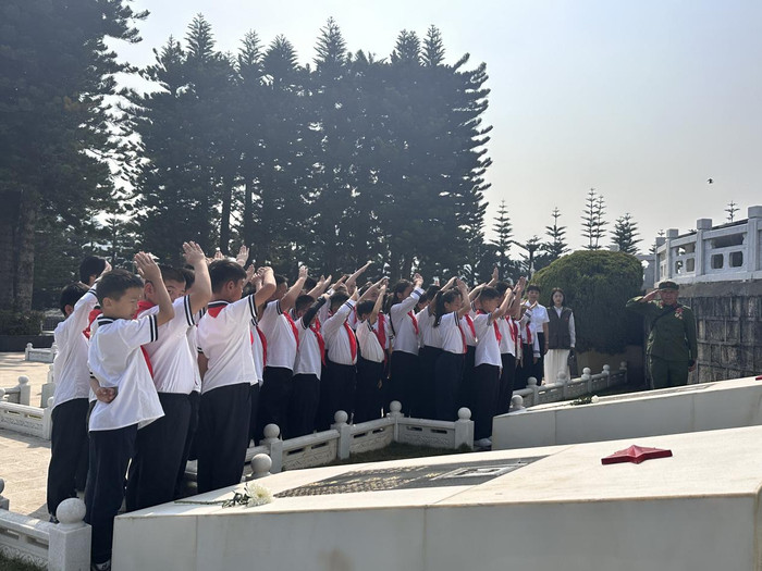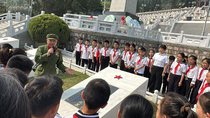 祭扫时刻,罗小平胸前的战功章引起了一支红色研学队列中师生们的防卫。几位少先队员主动向前,向他敬礼问好,得知这位来自深圳的老兵恰是以前战役的亲历者,带队诚恳当即邀请他为孩子们解说军旅岁月与战役追念。