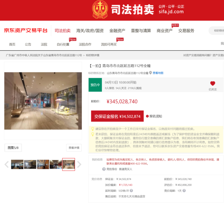 法拍平台信息表示,经现场探问阐明,拍卖主意物对应建筑为青岛富力艾好意思旅店,建筑面积达51077.53往常米,房屋贪图用途为交易,地盘使用年限至2047年11月24日止。本次拍卖由广州市中级东谈主民法院负责惩办,央求实施东谈主为招商银行广州分行,主意物扫数权东谈主为青岛万升旅店管制有限公司。拍卖将于4月13日上昼10时庄重启动,竞价周期为1天,属于初次拍卖,意向竞拍者需提前交纳3450万元保证金方可参与竞价。