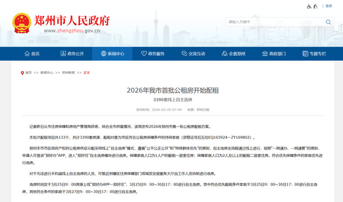3月24日,记者从郑州市住房保险和房地产措置局获悉,左证有关要求并都集全市供需情况,该局发布2026年郑州市第一批公租房配租决议。