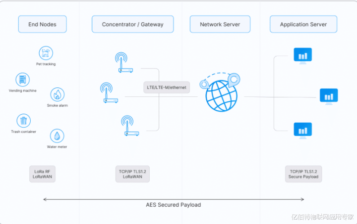 LoRaWAN 的组网逻辑可简化为三层合作架构,是限制化部署的基础: